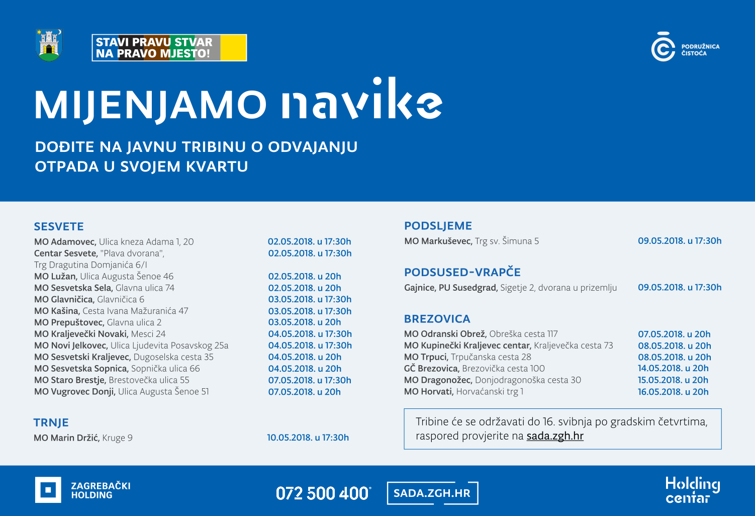 2. svibnja 2018. - Pogledajte raspored o održavanju tribina za nadolazeće razdoblje. Donosimo sve o odvajanju otpada, sve važne informacije i korisne savjete. Dođite i uključite se!